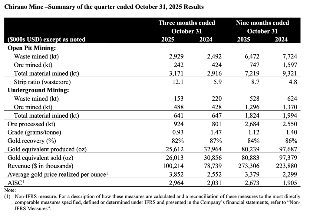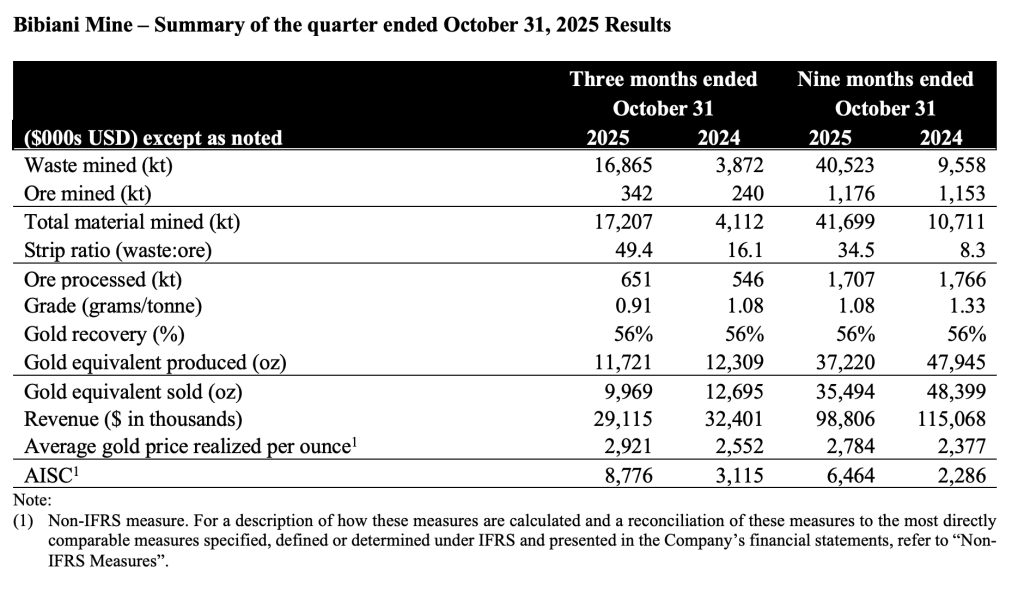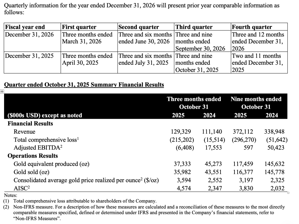 Adjusted EBITDA for the three and nine months ended October 31, 2025 were negative $6.4 million and positive $0.6 million, respectively, compared to positive $17.6 million and positive $50.4 million for the same periods in 2024. The decrease in Adjusted EBITDA reflects a lower volume of gold sold and higher production costs compared to the same periods of 2024.